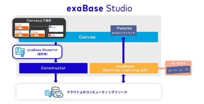 ●exaBase Machine Learning APIは、Paletteへ実行可能なAIモデル一覧を提供しつつ、Constructorが出力したクラウドインフラに対し、AIモデルを動的に統合し実行・結果取得するための機能をAPIとして提供します。