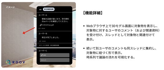 3Dモデル上の対象物を指定し、複数人が並行してコメントを書き込み、時系列で議論を追跡。