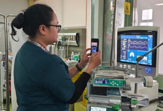 <『ICU Bridge』のAI-OCRを活用し、人工呼吸器モニターのデータを取り込む様子>