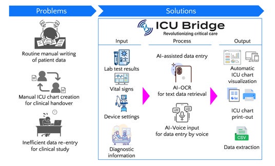 『ICU Bridge』は、ICU患者の情報を一元管理することで、医療スタッフが迅速かつ正確に患者の状態を把握することが可能となり、迅速な情報共有と高精度でのスムーズな引き継ぎを実現するシステムです。特長は、スマートフォン上のAI光学文字認識(AI-OCR)技術を活用したアプリケーション上で、バイタルサインモニター、医療機器設定画面、臨床検査結果などを撮影するだけで、『ICU Bridge』上にデータが自動的に反映される点です。各種医療機器モニターに対する精度検証では、95%以上の精度を達成していることが明らかとなっており、ICU患者の治療に必要な情報を一元化し、適切な患者管理をサポートします。また、各種医療機器等とのデータ連携に伴うコストがほとんど発生しないことから、あらゆる地域のICUにおいて導入することができます。
