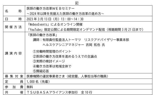 千葉銀行(頭取 米本 努)は、2023年3月13日(月)、「TSUBASAアライアンス」※1で連携する全10行と「医師の働き方改革WEBセミナー」を共催します。