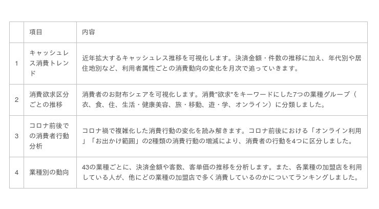 世の中の消費トレンドを業種別、性・年代別、エリア別などで分析可視化したレポートを、ご登録頂きましたメールアドレスに毎月お届けいたします。顧客消費トレンドを捉え、世の中の変化への打ち手としてご利用頂ける、無料配信のWEBレポートサービスです。