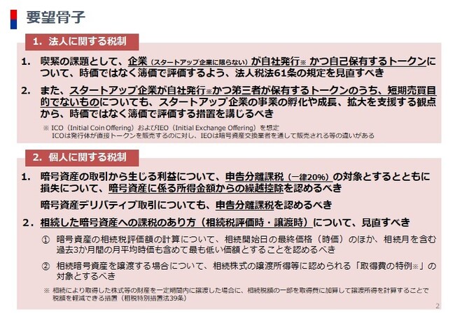 暗号資産に関する法人税制をめぐっては、ICO (※1)やIEO(※2) によりトークンを発行した企業がこれを自ら保有し続ける場合であっても、期末にそのトークンが時価評価され、含み益に課税される問題が指摘されています。このような未実現利益への課税は主要先進国でも例がなく、予見可能性や担税力の観点で問題が多いことから、スタートアップを中心としたWeb3.0企業が海外に転出する原因の1つとなっています。このため、トークンを自社発行・自社保有するケースについて、時価ではなく簿価で評価するよう求めました。また、スタートアップ企業の事業の孵化や成長、拡大を支援する観点から、スタートアップ企業が発行したトークンを第三者が保有している場合、短期売買目的でないものについては時価ではなく簿価で評価するよう要望しました。このほか、個人の税制については、昨年の税制改正要望と同様、暗号資産取引から生じる利益を申告分離課税の対象とするよう求めました。