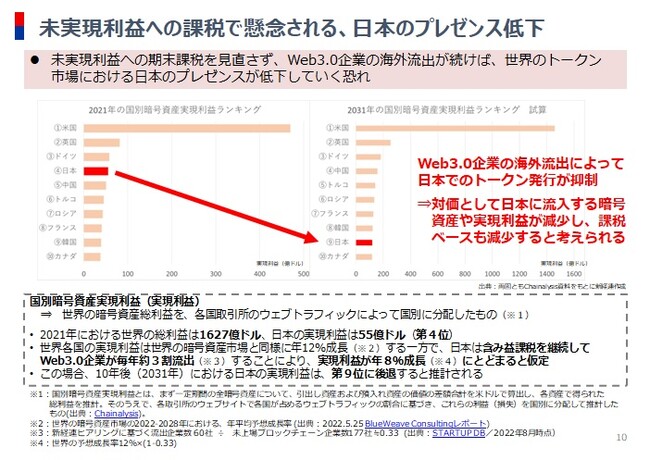 新経連の三木谷浩史代表理事は、6月に刊行された設立10周年の記念書籍において、「暗号資産の未実現利益に法人税が課されることが、企業にとって大きな負担となっている。ブロックチェーン関連の法制度にはグレーゾーンも多く、国内の有望なスタートアップが海外転出を検討する理由になっている」とコメントしています(『JAPAN TRANSFORMATION~日本の未来戦略~』)。
