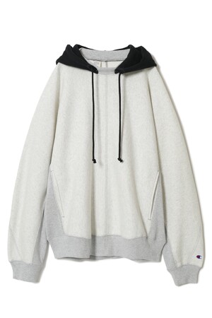 Champion を代表する製法の「REVERSE WEAVE(R)」を再構築し、着込むほどに独特の風合いや味わいが出る11.5oz(11.5オンス)の裏起毛素材を身体に沿った立体裁断で組み上げ、前身頃からスリーブの上部、後身頃にかけて一枚の生地で製作したフーデッドスウェットシャツです。