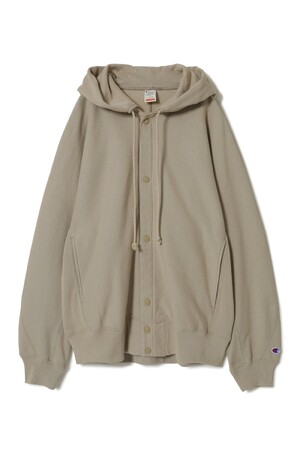 Champion を代表する製法の「REVERSE WEAVE(R)」を再構築し、着込むほどに独特の風合いや味わいが出る11.5oz(11.5オンス)の裏起毛素材を身体に沿った立体裁断で組み上げ、前身頃からスリーブの上部、後身頃にかけて一枚の生地で製作したスナップフーデッドスウェットシャツです。