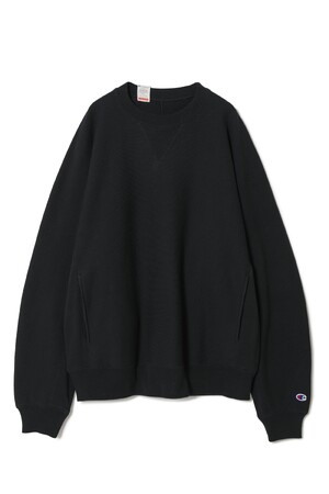 Champion を代表する製法の「REVERSE WEAVE(R)」を再構築し、着込むほどに独特の風合いや味わいが出る11.5oz(11.5オンス)の裏起毛素材を身体に沿った立体裁断で組み上げ、前身頃からスリーブの上部、後身頃にかけて一枚の生地で製作したクルーネックスウェットシャツです。
