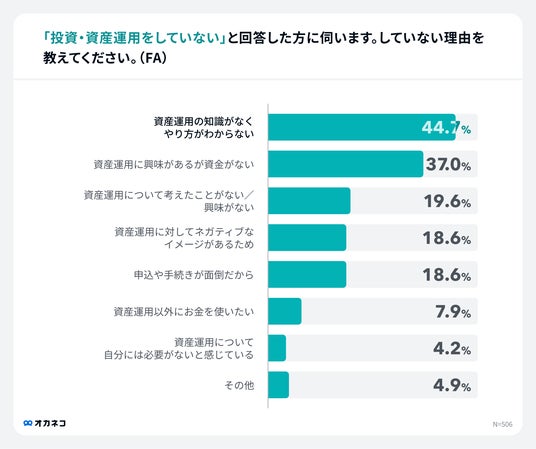 また、投資・資産運用をしていないと回答した方に「していない理由を教えてください。」と質問したところ、44.7%の人が「資産運用の知識がなくやり方がわからない」と回答し、投資・資産運用について手続きや情報面でのサポート不足により行動に移すことができないことが判明しました。
