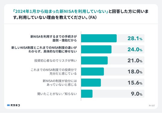 新NISAを利用していないと回答した方に「利用していない理由を教えてください。」という質問に対し、「新NISAを利用するまでの手続きが面倒・億劫だから」28.1%、「新しいNISA制度とこれまでのNISA制度の違いがわからず、具体的な行動に移せない」24.0%という結果になりました。