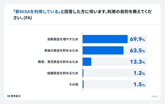 さらに、利用していると回答した方に「利用の目的を教えてください。(複数回答)」と質問したところ「余剰資金を増やすため」が最も多く69.9%、次いで「老後の資金を貯めるため」63.5%と余剰資金を上手く資産運用に回し、将来の資金対策をしている人が多い傾向が分かりました。また、自由回答では「非課税保有期間が無期限になったから」「制度改正が始めるきっかけになった」「成長投資枠とつみたて投資枠が併用可能になったから」など新NISA制度に魅力を感じる声が多く上がりました。