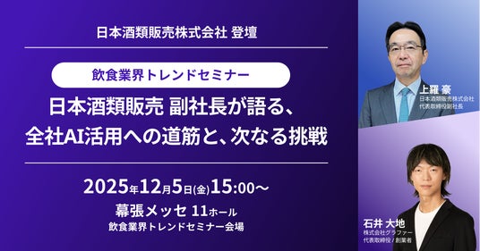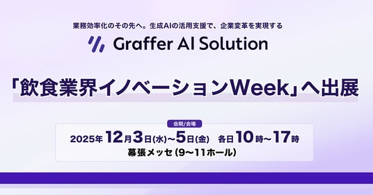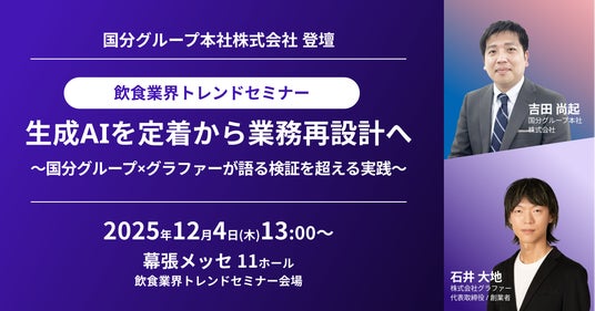 生成AI活用による企業変革を実現する株式会社グラファー(本社:東京都渋谷区、代表取締役:石井大地、以下「当社」)は、2025年12月3日(水)~5日(金)に幕張メッセで開催される「飲食業界イノベーションWeek 東京」に出展します。会期中には、展示会場内セミナー「飲食業界トレンドセミナー」において、4日(木)に国分グループ本社株式会社、5日(金)に日本酒類販売株式会社を迎えた対談セッションを開催します。