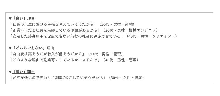 一方「どちらでもない」と回答した37.3%の人からは、「副業にあまり興味がない」(20代・女性・製造)など、そもそも副業に関心がないため、良い印象も悪い印象も持たないとする声が挙がりました。