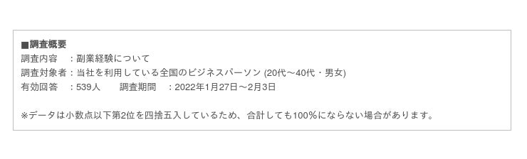総合転職エージェントの株式会社ワークポート(所在地:東京都品川区、代表取締役社長 CEO:田村高広)は、全国のビジネスパーソン539人(20代~40代・男女)の、「副業経験」についてアンケート調査を行いました。