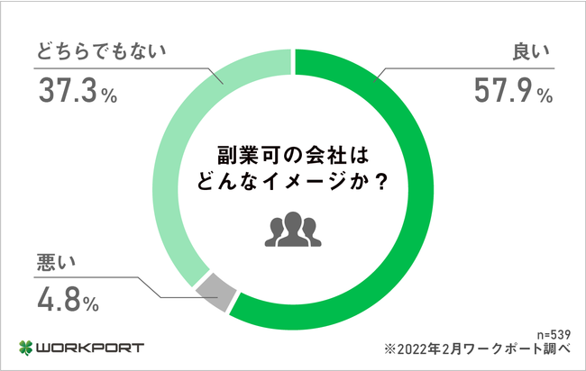 調査対象者全員に副業OKな会社のイメージを聞いたところ、半数を超える57.9%がよい印象を抱いていることがわかりました。