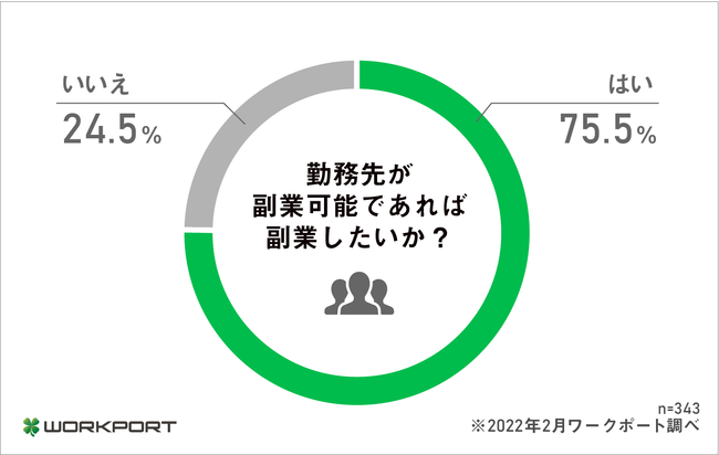 現在の勤務先(離職中の人は直近の勤務先)が副業不可と回答した人343人に、勤務先が副業可能であれば副業をしたいか聞いたところ、75.5%の人が「会社がOKなら副業したい」と、副業への意欲を見せました。