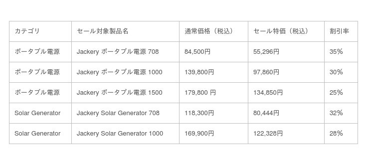 今回のセールでは売れ筋商品のJackery ポータブル電源 708、Jackery ポータブル電源 1000に加えて、ホットプレートやIH調理器、ドライヤーなどの高出力家電も動かせることから「キャンプを変える」と言われたJackery ポータブル電源 1500も特別価格で登場。さらにポータブル電源とソーラーパネルを組み合わせたオールインワンの太陽光発電システムで節電対策ができる「Solar Generator」シリーズもセール対象製品です。欲しかった製品がお得に手に入る、48時間限定の特別セールがいよいよ始まります。