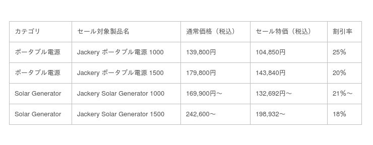 ※Jackery Solar Generatorは、ソーラーパネルの枚数により価格、割引率ともに変わります。