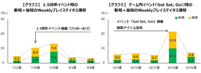 また、その週に獲得した新規・復帰ユーザー数を見るとトラブルがあった10月24日週には新規・復帰ともに10万人以上のユーザーを獲得しています。【グラフ4.】