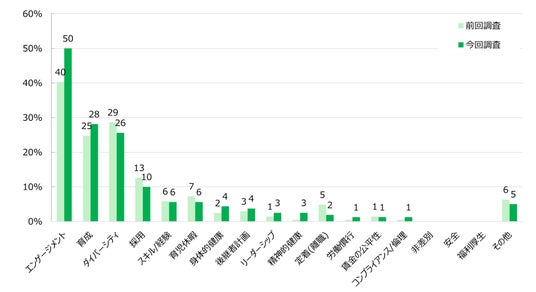 「人材戦略の中で重要視している指標」について見ると、今回調査では「エンゲージメント」(50%)が最多となり、前回調査(40%)から10ポイント上昇しました。次いで「育成」(28%)、「ダイバーシティ」(26%)が続いています。上位3項目の構図自体は前回調査時から継続しているものの、「育成」が「ダイバーシティ」を上回った点は注目されます。