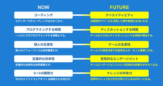 これまで「コーディング」が中心だった開発現場は、AIツール等を使った要件整理や企画設計が主流となり、「クリエイティビティ」の重要性が高まっています。その結果、エンジニアは「プログラミングをする時間」とあわせて、チームメンバーや生成AIと「ディスカッションする時間」が増加していくでしょう。