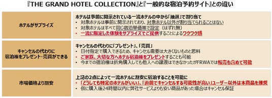 ユーザーが感じる一般的な宿泊予約サイトとの違いは「ホテルがサプライズ」「キャンセルの代わりに宿泊権をプレゼント・売買ができる」「一般的な予約サイトと比べて割安」の3点です。ホテルから見るとリスクを移転していることにはなりますが、ユーザーにとっては「一流ホテルがサプライズというワクワク感」に加え、「ご家族や大切な方へのプレゼントとして使えること」、「転売も可能」であることから弊社は今までになかったホテルの体験価値をご提供できると考えます。さらに本商品は一般的な宿泊予約サイトに比べ割安であることから、「経済合理性の高い、新しくスマートな宿泊の楽しみ方」をご提案するという点でユーザーのメリットは非常に大きいものと考えています。