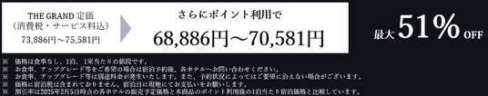 本サービスの価格は「THE GRAND HOTEL COLLECTION(ザ グランドホテル コレクション)」の定価で1泊当たり73,886円~75,581円(消費税、サービス料込)と一般的な宿泊予約サイトと比べて割安となっていますが、さらにLINE会員登録をしていただいた方へ5,000円分のポイントをプレゼントいたします。よって同ポイント利用後では68,886円~70,581円という値段でお買い求めが可能です。同価格は2025年2月5日時点における、本サービスの宿泊対象期間中のホテルの販売価格から最大51%オフとなっています。