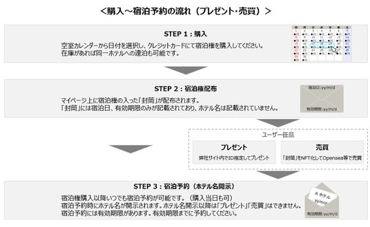 本サービスは夏休み時期の2025年6月1日から2025年8月31日までの日程を販売します。ユーザーは空室カレンダーよりご自身の都合に合わせて日程を選択(1泊単位)し、クレジットカードで購入をしていただきます。在庫次第ではありますが、同一ホテルへの連泊も可能です。ホテルに関しては上記3つの中から抽選で選ばれます。上記以外のホテルが当たることはありません。購入から宿泊予約の流れに関しては下記図をご参照ください。