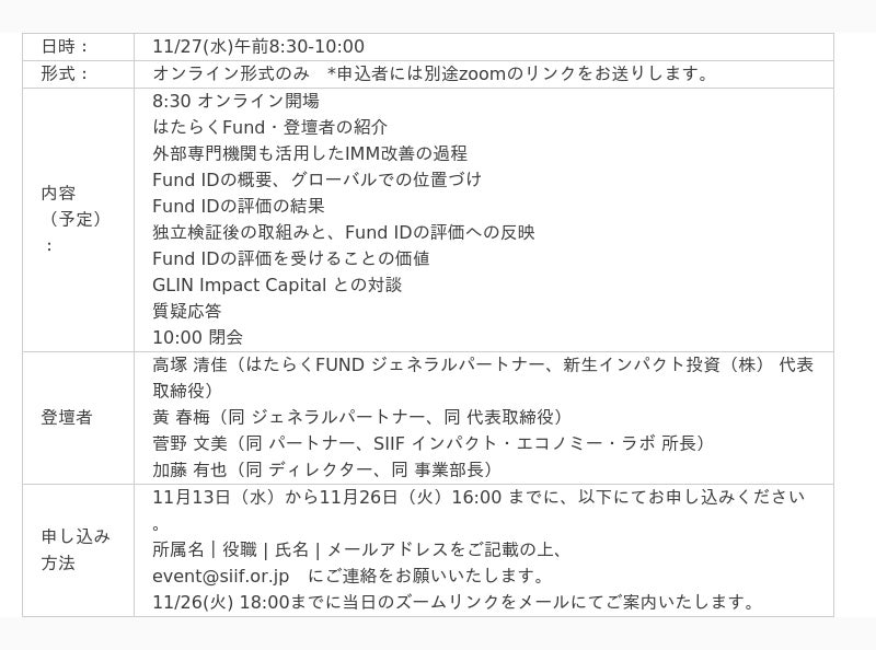 このような視点を踏まえ、「はたらくFUND 外部専門機関の独立検証を活用したインパクト測定・マネジメントの深化に関する勉強会」を11月27日(水)に開催することといたしました。勉強会では、具体的な推進にご尽力されているみなさまのご参考としていただくことを目的に、外部専門機関のアドバイスをどのように受け入れ改善してきたかやチーム内での議論の変遷等を紹介し、活発に議論する予定です。