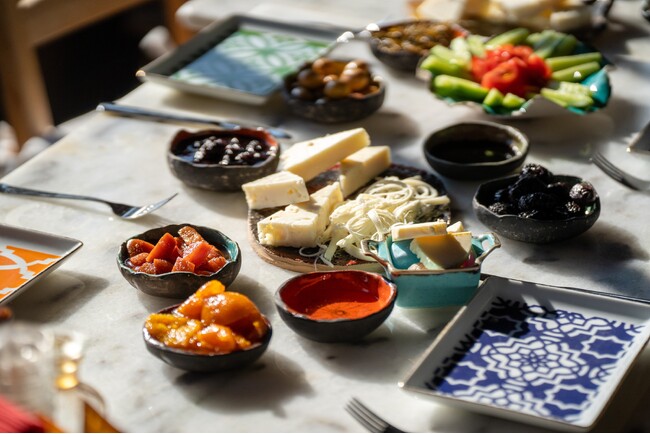 リッチでボリューム満点、そして美味しいトルコの朝食は、一日の始まりに理想的な食事です。レストランで朝食を注文すると、テーブルに運ばれてくる食べ物の数々に驚くかもしれません。白チーズ、トゥルムチーズ、カシャールチーズ、チョケレキチーズ、ミハリチチーズなどの各種チーズ、マルマラ産、エーゲ海産、北エーゲ海産の味わい深いグリーンとブラックオリーブ、新鮮なキュウリ、トマト、ピーマン、青菜、蜂蜜、自家製ジャム、カイマク(クロテッドクリーム)など。卵、ピーマン、トマトを使った朝食に欠かせないメネメンもぜひお試しください。シミット、温かいパン、チューリップ型のグラスに入った淹れたての紅茶も外せません。
