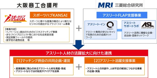大阪商工会議所(会頭:鳥井信吾)と、株式会社三菱総合研究所(代表取締役社長:籔田健二、以下 MRI)は、アスリート人材の活躍による企業や地域の課題解決や、イノベーションの創出に共同で取り組んで参ります。スポーツ・ウエルネス産業振興にアスリートの知見やアイデアを取り入れて施策を充実させるとともに、ビジネスで活躍できるアスリート人材を発掘・育成することで、スポーツ界で長年の課題となっているアスリートのキャリア形成に貢献します。