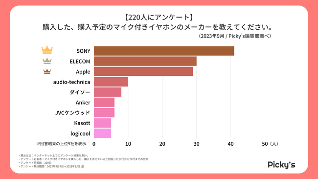 「SONY」が最も多い結果となりました。続いて、ほぼ同数で「ELECOM」、「Apple」が選ばれています。
