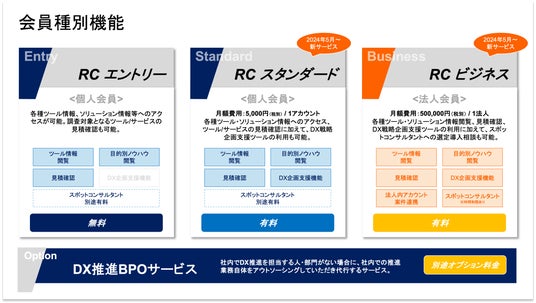◼️RCビジネス(有料)月額費用:500,000円(税別) / 1法人 各種ツール・ソリューション情報閲覧、見積確認、 DX戦略企画支援ツールの利用に加えて、スポッ トコンサルタントへの選定導入相談も可能。