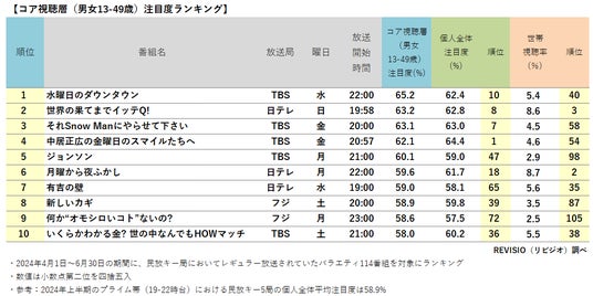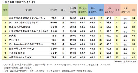 以上、2024年上半期のバラエティ番組注目度ランキングを分析すると、番組ごとの視聴層の違いが如実にわかる結果となりました。