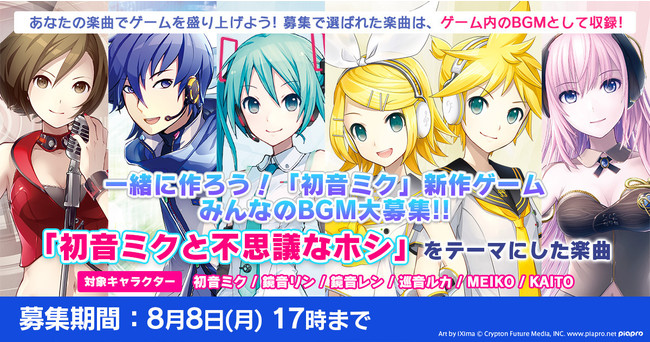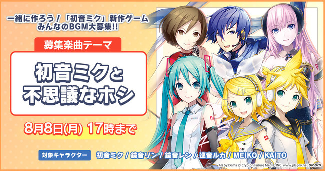 クリプトン・フューチャー・メディア株式会社(本社:北海道札幌市、代表取締役:伊藤博之、以下クリプトン)は、バーチャル・シンガー『初音ミク』が登場する新作ゲームのBGMを、2022年8月8日(月)17:00まで一般公募いたします。募集テーマは「初音ミクと不思議なホシ」。歌声合成ソフトウェア『初音ミク』『鏡音リン』『鏡音レン』『巡音ルカ』『MEIKO』『KAITO』いずれかを使用した5分以内の楽曲が対象です。自作曲がゲームに収録されるチャンスですので、ぜひご応募ください。