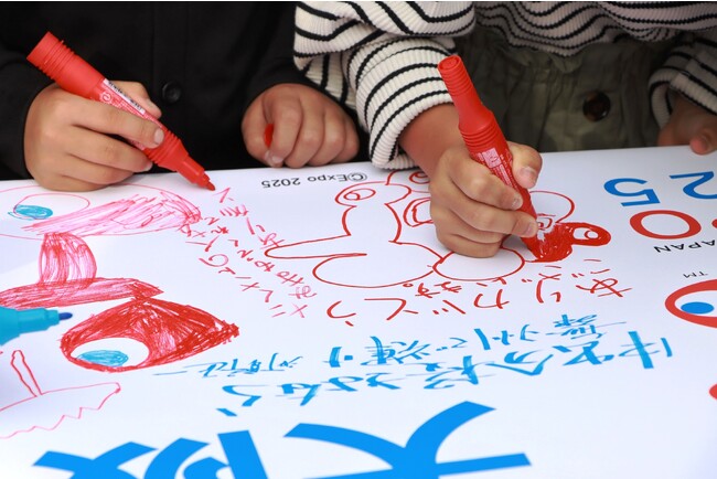 その後、セレモニーパネルに参加者が「お別れメッセージ」を記入。パビリオンに生まれ変わる旧細見小学校中出分校に向けて「あたたかな想い出をありがとう」「たくさんの人々に見てもらって下さい」などのメッセージが書き込まれました。