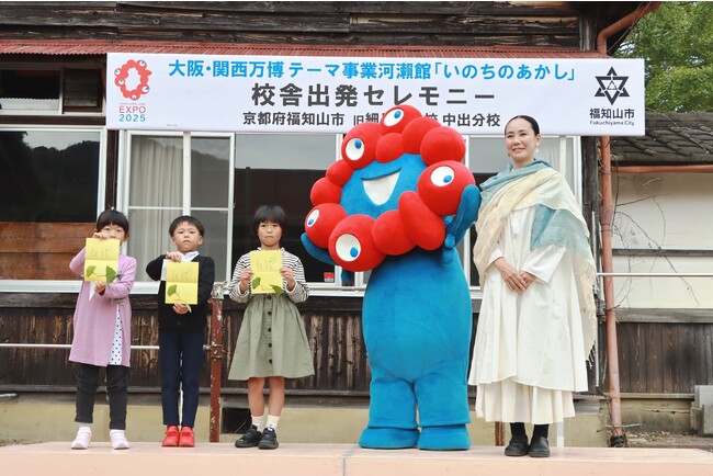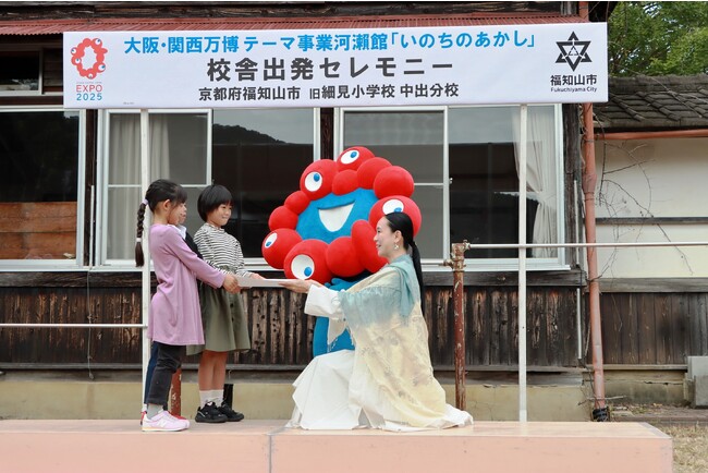 小学校の卒業生や元教師ら地元関係者を前に、福知山市長や大阪・関西万博テーマ事業プロデューサーの河瀬直美さんらがあいさつ。大阪・関西万博公式キャラクターの「ミャクミャク」が見守るなか、中出分校の通学区域に住む子どもたちから、感謝と期待を込めた校舎の「卒業証書」が河瀬プロデューサーに手渡されました。