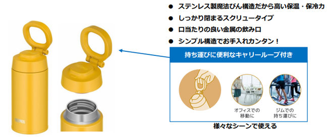 『サーモス 真空断熱ケータイマグ(JOO-380)』は、オフィスでの移動からスポーツシーンまで、室内・屋外問わず、より多くのシーンで活用してほしいとの思いから開発されたキャリーループ付きのケータイマグです。ボトルをカバンに入れて持ち運ぶだけでなく、“ボトルだけを持ち歩く”というスタイルを提案します。
