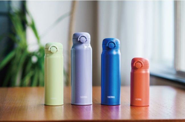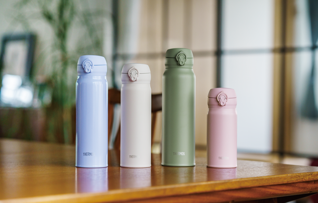 このたび、カラーを一新。近年人気が高いマットで落ち着きのあるカラーのスモークカーキやスモークブラック、アッシュホワイト、モーヴピンク、パステルカラーが可愛く使いやすいパールブルー、クリームイエローをラインアップとして追加。サイズは、0.35、0.5L、0.6L、0.75Lの4サイズを展開。サーモスのベストセラーモデルとして幅広い年代に手にとっていただけるカラーラインアップにしました。