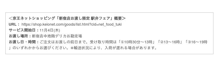 京王百貨店(本社:東京都新宿区、社長:駒田一郎)新宿店では、中地階デリカコーナーにて11月4日(木)~12月1日(水)の期間、2週間ごとに内容を一部入れ替えながら人気の駅弁を計60種類展開する「駅弁フェア」を開催します。店頭での販売のほか、ECサイト上での事前決済・店頭受取も可能で、目当ての駅弁を品切れの心配なくスムーズに受け取ることができます。