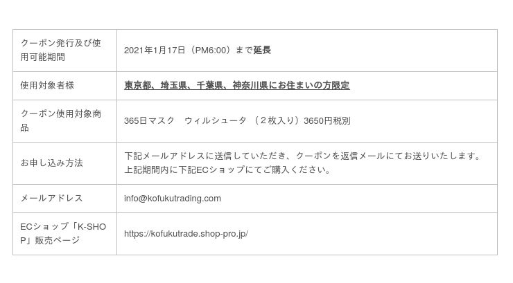 和牛や清酒など日本食品と衛生用品を中心に貿易を手がける宏福商事合同会社(本社:東京都荒川区)は12月28日(月)、抗菌マスク「365日マスク ウィルシュータ」を7500個緊急追加販売を開始しました。1月10日から緊急事態宣言の地域限定でマスク半額クーポンを発行していましたが、大好評の為、期間を延長いたします。アドレスにメールを送れば、半額で購入できます。