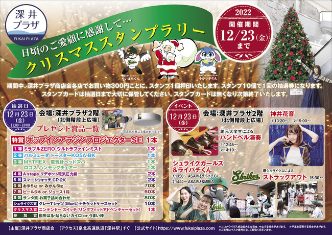 さらに23日(金)には、深井プラザ商店会の2階の北側階段上広場にて、クリスマスの雰囲気を盛り上げる地元学生達のハンドベル演奏、和風ガールズユニットのヴォーカリスト神井花音さん、シュライクガールズとチームマスコットのライパチくんによるLIVEステージ、堺シュライクスの選手による野球のストラックアウトの体験ゲームなど一日中楽しめるイベントがもりだくさんです。