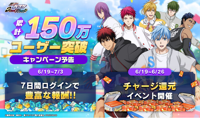 株式会社ファイブクロスは、アニメ『黒子のバスケ』の3Dバスケゲーム『黒子のバスケ Street Rivals』(黒バスSR)において、150万ユーザーを突破したことを発表いたしました。