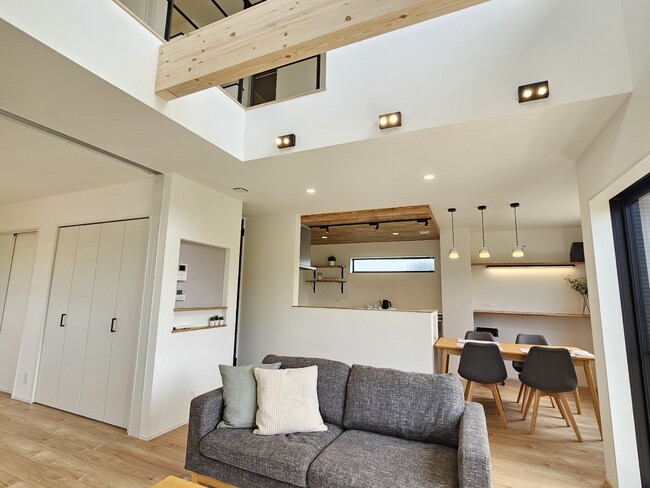 特長の二つ目は、効率的でシンプルかつ飽きのこない室内空間提案です。間取りは、1階にLDKと水廻り、2階には主寝室と居室を2部屋配置し、4人家族が実際に住むことを想定した等身大の暮らしを体感できる間取りとなっています。3方向に窓を設けた吹き抜けのLDKは、トリプルサッシの採用で明るさと断熱性能の両方を確保しています。また、フロストガラス※3の内部建具で目隠ししつつも、奥の部屋まで明かりを採り込むことができます。さらに、アイアンの手摺やキッチンの折り下げ天井、吹き抜けに配した梁など、シンプルな中にもアクセントを付けて飽きのこないデザインとしています。