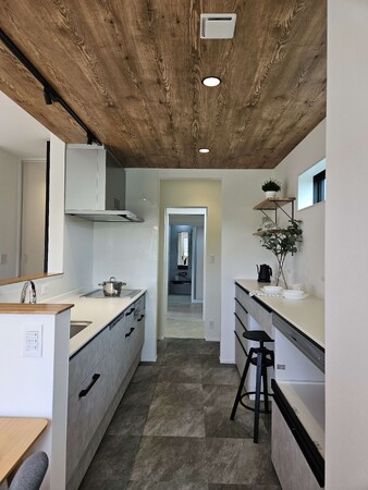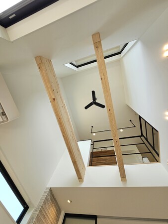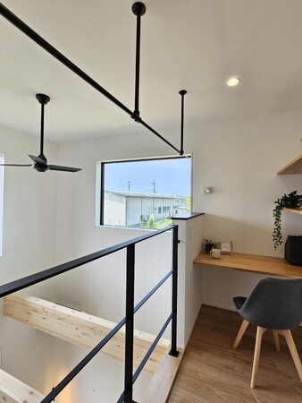 アイアンの手摺やキッチンの折り下げ天井、吹き抜けに配した梁など、シンプルな中にもアクセントを付けて飽きのこないデザインとしました。