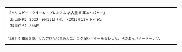 クリスピー・クリーム・ドーナツ・ジャパン株式会社(本社:東京都渋谷区、代表取締役社長:若月 貴子、以下:KKDJ)は、ジェイアール名古屋タカシマヤ店限定「クリスピー・クリーム・プレミアム 名古屋」の新商品として、『クリスピー・クリーム・プレミアム 名古屋 和栗あんバター』と『クリスピー・クリーム・プレミアム 名古屋 ブリュレ グレーズド ほうじ茶』を、2023年9月13日(水)より期間限定で販売します。