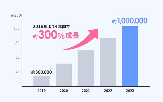 「Xserverドメイン」は、シンプルな料金設計や分かりやすい画面設計など、ユーザーにとって安心して利用できるサービスの提供に取り組んでいます。長年の取り組みで多くのユーザーにご支持いただいた結果、登録ドメイン件数の累計が100万件を突破しました。2019年の累計と比較して4年間で約300%の成長を遂げており、これは国内ドメイン取得サービスにおいてNo.1の成長率となっています。