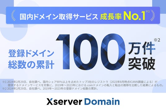 エックスサーバー株式会社(所在地:大阪市北区、代表取締役:小林 尚希)は、国内最安値(※1)のドメイン取得サービス「Xserverドメイン」において、登録ドメイン件数の累計が100万件(※2)を突破しました。2019年の累計と比較すると4年間で約300%の成長を遂げており、これは国内ドメイン取得サービスにおいてNo.1の成長率(※3)となっています。