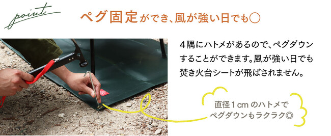 四隅のハトメにペグ打ちができるので、風がふいても巻きあがらないから風のある日でも安心して使用できます。