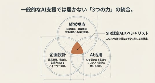 SIRのAI支援スペシャリストが、経営・事業の文脈に沿ってAIを活用し、企画の発想・整理・構造化・言語化まで伴走支援することで、企画立案の質を高める点にあります。