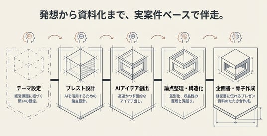 発想支援にとどまらず、企画書骨子、提案ストーリー、説明ロジック、論点整理まで支援することで、実務で活用しやすい形に落とし込みます。